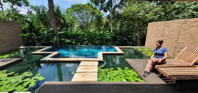 After we finished checking in , one of the staffers escorted us to our cabin which was a few mins walk from the reception area. Almost immediately I was floored by the property with its well kept paths, giant trees and the beautiful tweeting of birds. While walking she explained about the various activities available, the timings of the restaurants and facilities. Since it was near lunch time we dumped our luggage in the room and explored the cottage & pool for a bit before walking over to the Granary multi cuisine restaurant which was about 10-15 minutes’ walk from our room for lunch. We were one of the first people to arrive for lunch and after our temperature was taken we were seated at a windowside table overlooking the pool. The pool was closed due to Covid but the view was amazing and we even had a lot of birds (Sparrows) flying around inside the restaurant. I wanted to feed them some bread but Jani refused to let me as she felt that it would create a nuisance for the staff and other guests who might not like it.