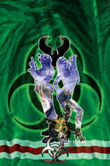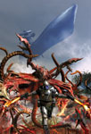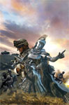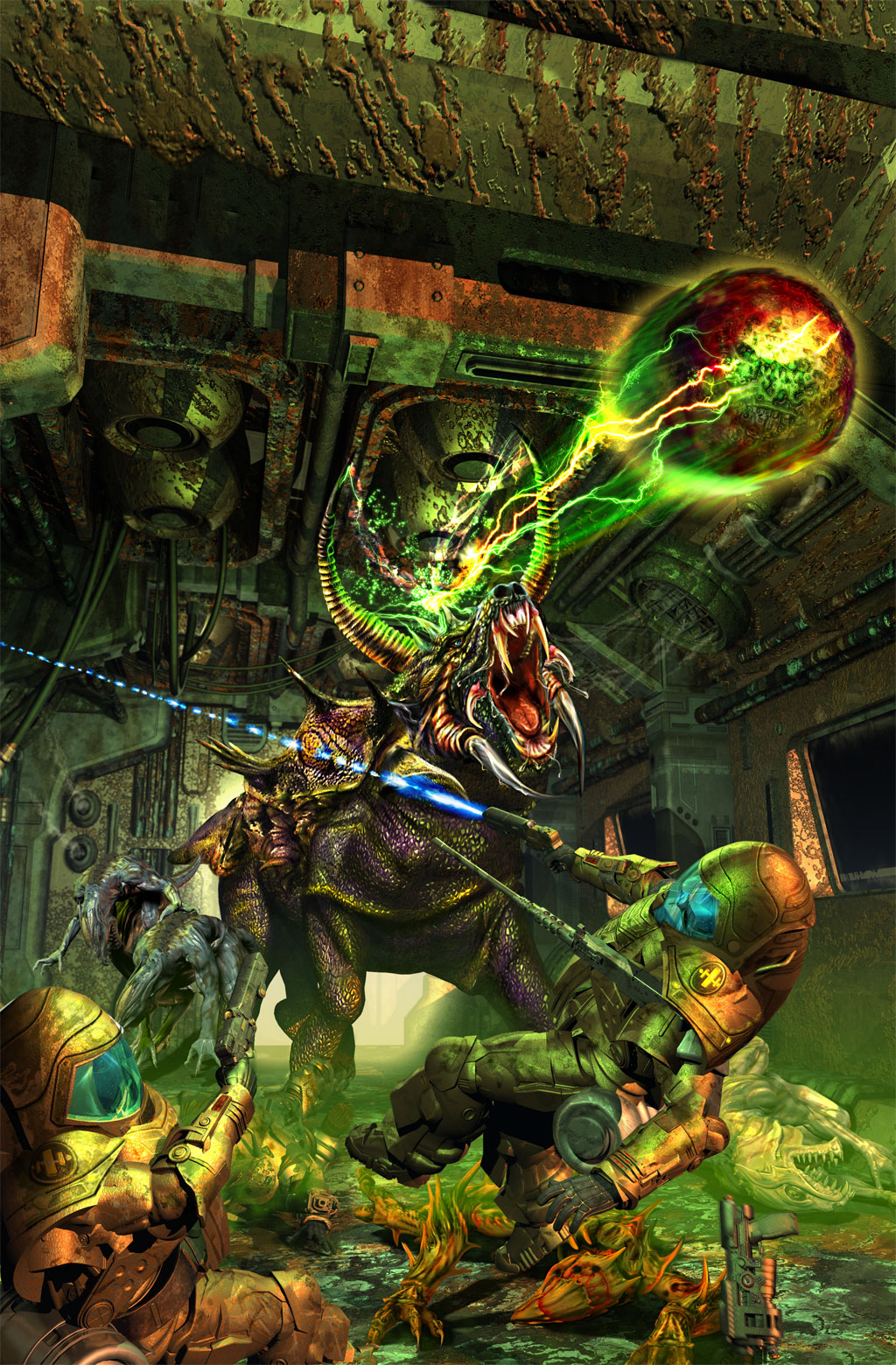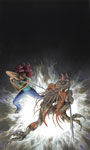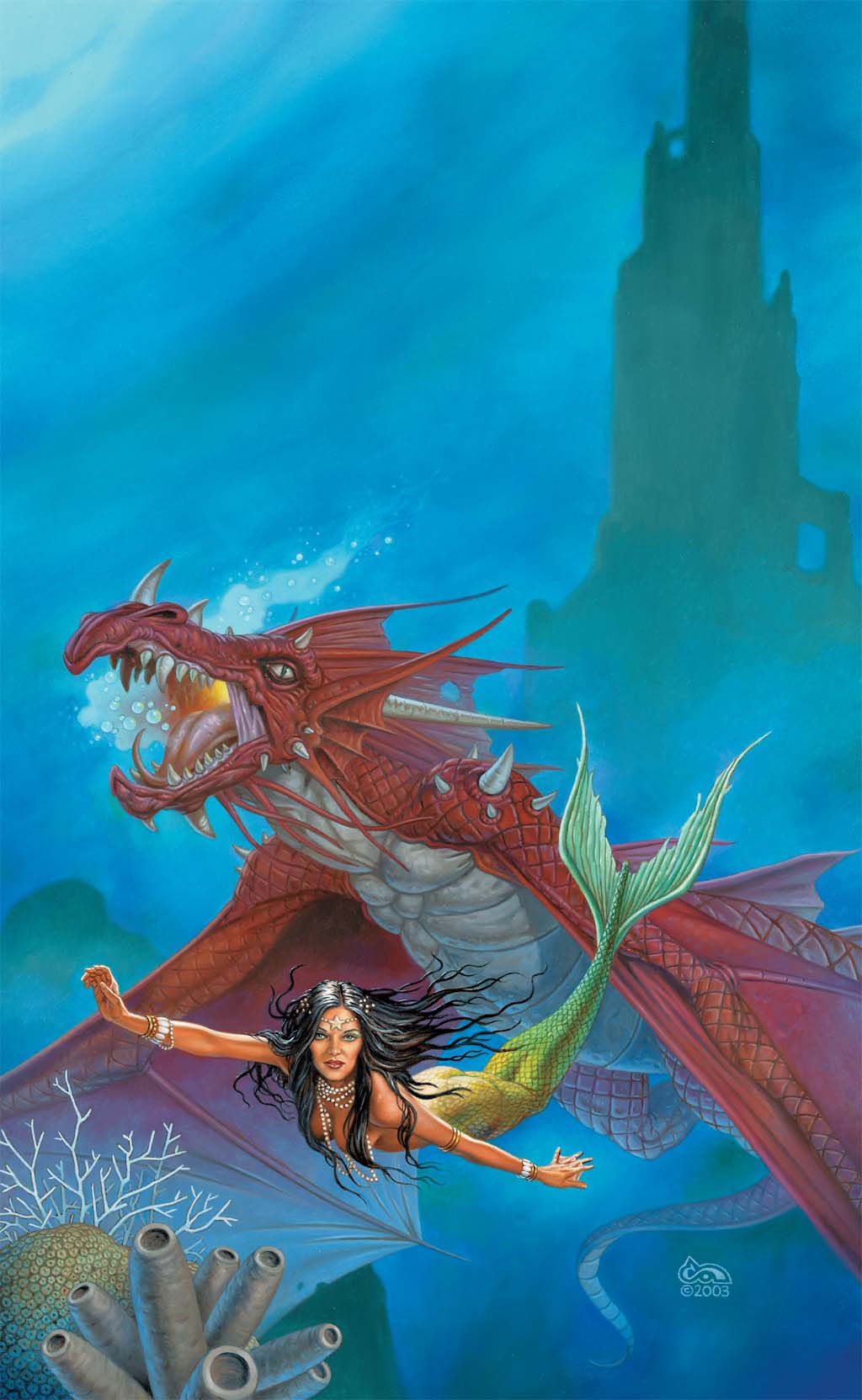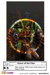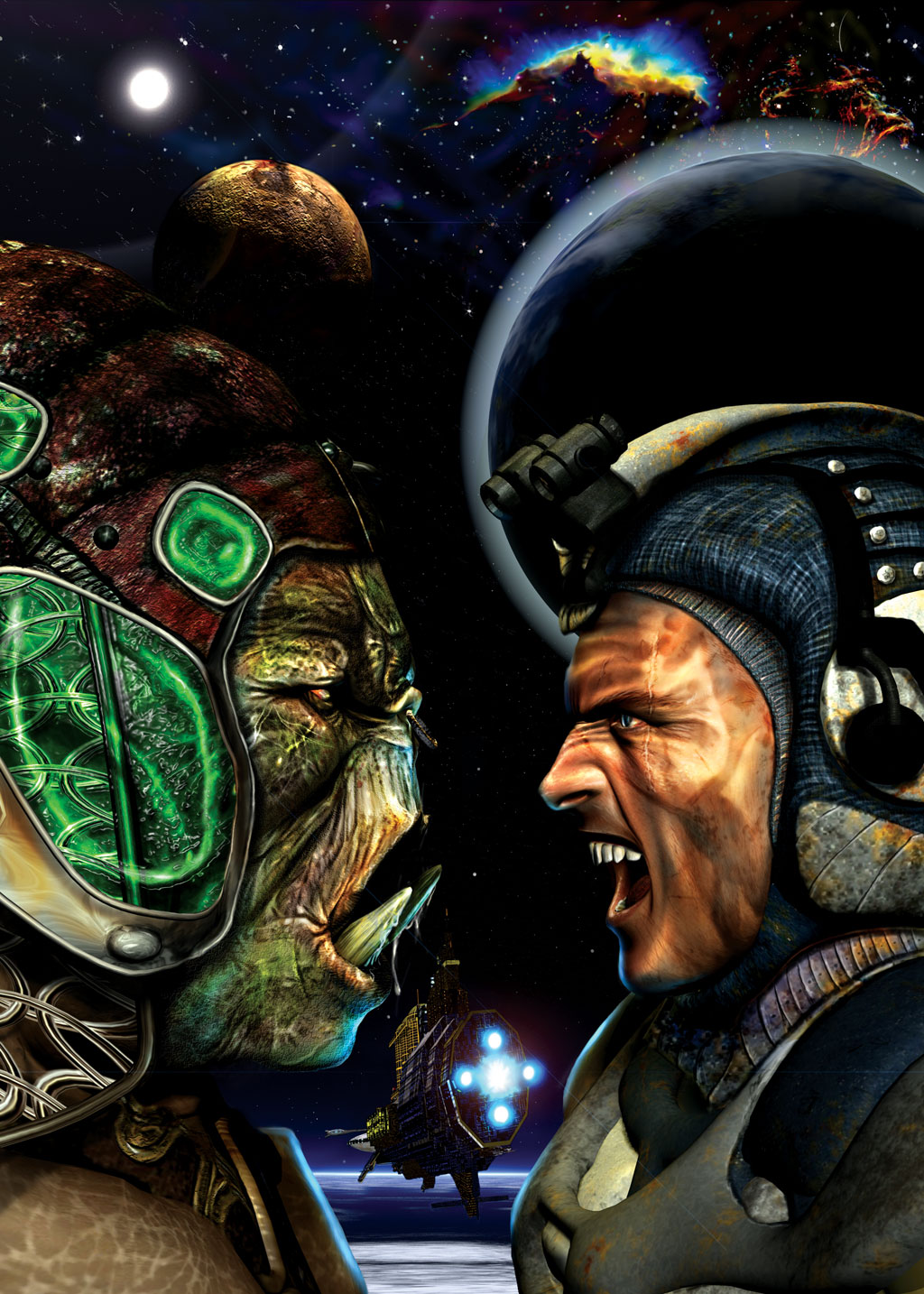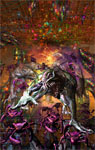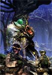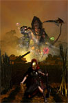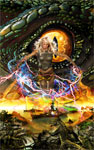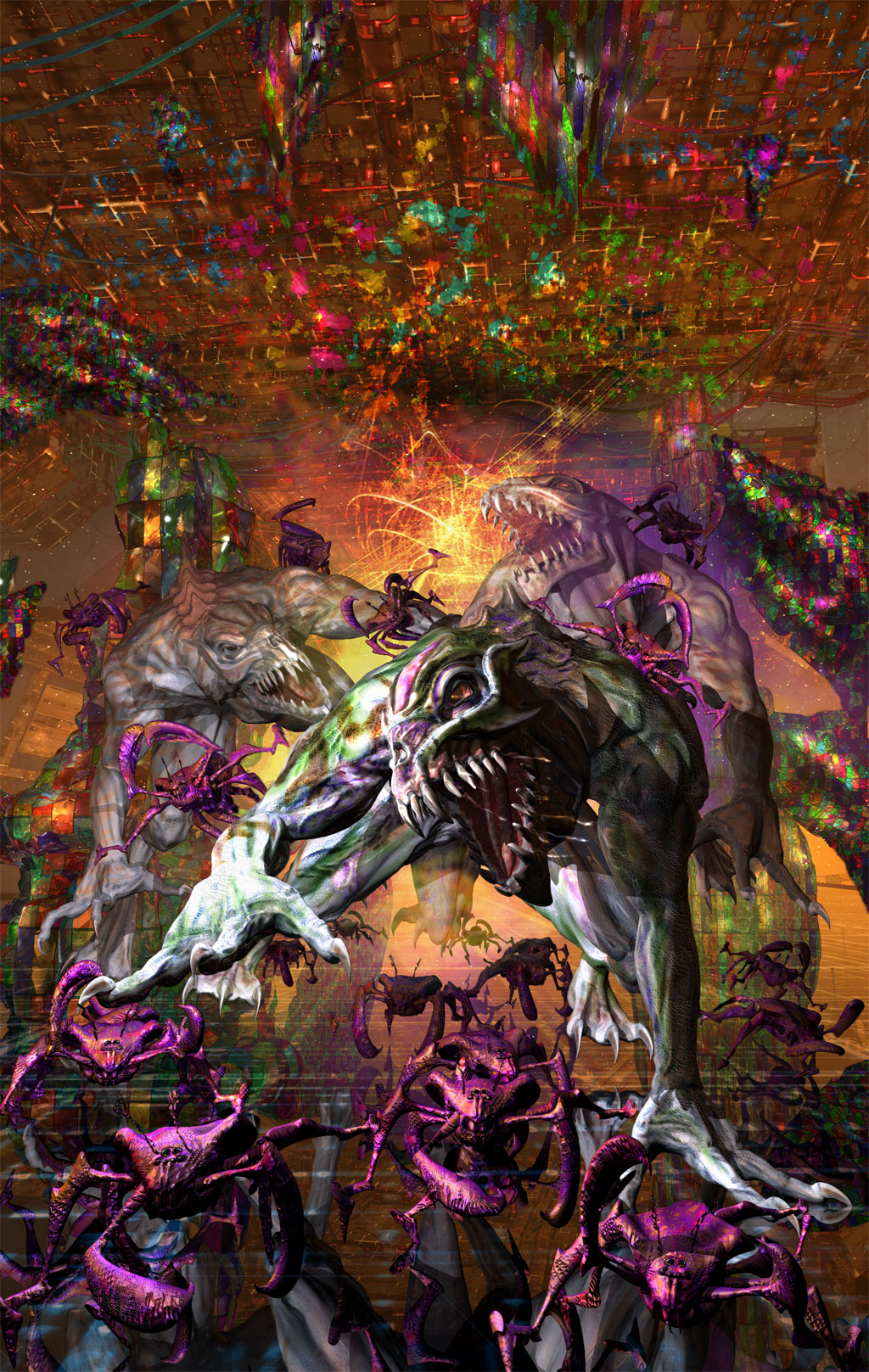 R-1 cover rough was created in 3D max, Poser 7, Bryce 6 and a finish touch in Adobe Photoshop with a Wacom tablet. The Dreen dog-demon were modeled in 3D max and collaborated with Sanctum Art, Inc. and later imported into Bryce 3D. Purple crab spiders were modeled in Poser and later imported into Bryce 3D. The interior of the Tum Tum Tree ship was modeled in Bryce. After all imports and some environment adjustment a final render was made for Photoshop to add that last finish touch. |