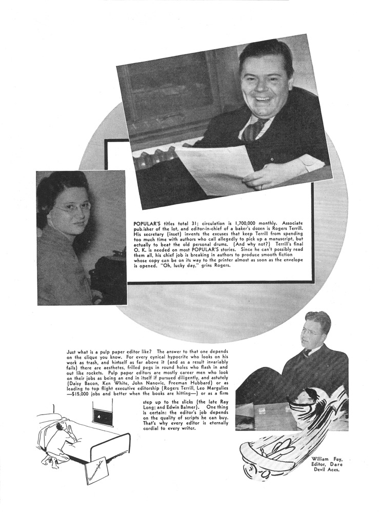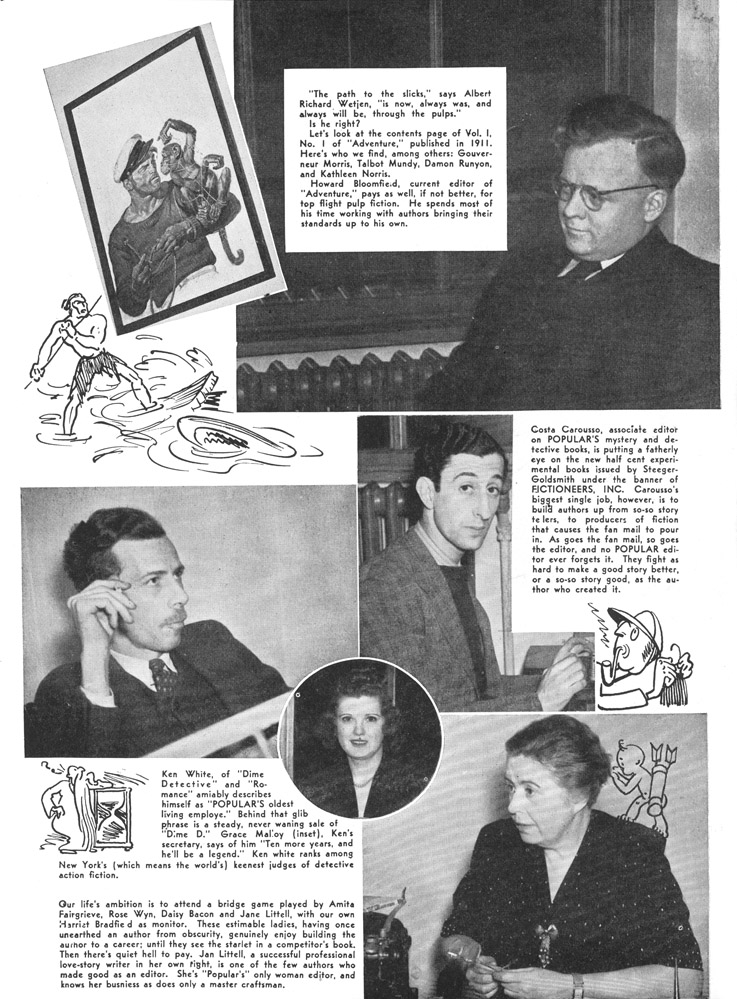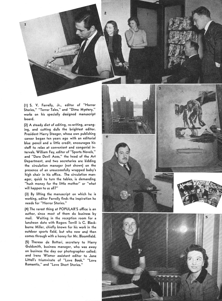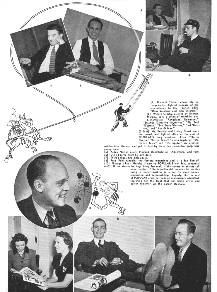 Popular Publications From Writers Year Book 1940 Writers Digest from the 1930's and '40s is a treasure-trove of information about what it was like to be a writer in that time, and more often how to write for and sell to magazines of the time. If you were interested in writing fiction, then more often than not this meant Pulp magazines. Occasionally looking through old issues, you'll come across something really special -- like this pictorial of the biggest Pulp producer of the time, Popular Publications, publisher of The Spider—Master of Men! The preceding was taken from the 1940 Writers' Year Book, published annually in March by Writer's Digest. The Spider TM & © Argosy Communications, Inc. |