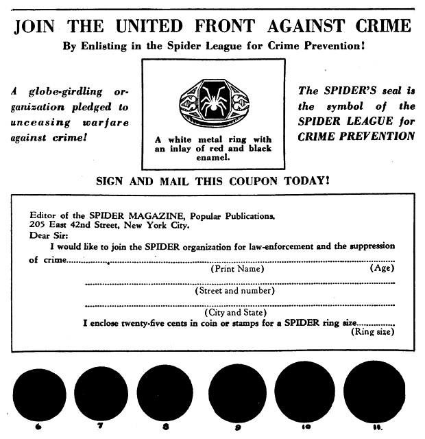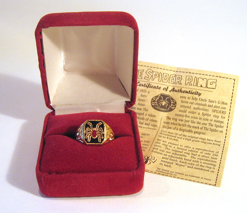The Spider Ring The Spider Ring was first offered in the pages of The Spider in the March 1934 issue. Not coincidentally, this issue's story, "Citadel of Hell," marked the first time the Ring had been featured in an adventure. (Though it had been shown on the cover since the first issue, presumably as a nod to The Shadow's own signature ring.) For 25 cents in coin or stamp, and the promise to curtail crime in their neighborhood, readers could own their very own replica of The Spider's ring! The Spider Ring is one of the most sought after premiums today. Harry Steeger remarked that "thousands and thousands" were sold, enlisting proud wearers in the Spider League of Crime Prevention, but today less than 30 have been documented in any condition. A genuine Spider Ring will have the maker's logo on the inside of the band: an arrow through the letter "U" to represent "Uncas." Around 1940, the company also started to stamp "Made in USA" on the inner band as well to differentiate it from japanese products. GOOD $800 | FINE $2500 | VERY FINE $4500 | NEAR MINT $8500 (Hake's)