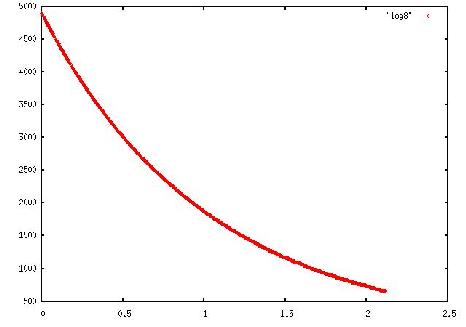 The trig_read_block function collects 1000 samples from the ADC with an in-between delay of 2000 micro seconds. The sample collection starts only when the trigger is received, the trigger being a falling edge on digital input pin 0. The value returned by the function is a list, each element of which is a tuple of the form (timestamp, adval) where `timestamp' is the instant of time when the sample was taken. The `for' loop simply prints these numbers onto the screen; the output can be redirected to a file and plotted using the powerful `gnuplot' utility (a simple command at the gnuplot prompt of the form plot "a.dat"). Here is the graph which I obtained: