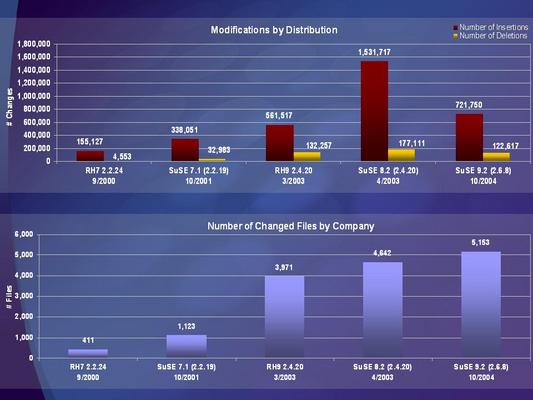 Among the slides and varied commentary, Matusow cited the complexity of a major OS which may require large companies [or a large community] for support, and pointed out that, historically, patch numbers go up over time and as versions progress [i.e., Linux patching will eventually become more like MS patching]. So the increasing patching "... demonstrates the amount of engineering effort from Novell and Red Hat." He demonstrated 2 graphs as supporting evidence -