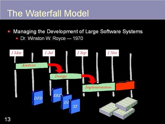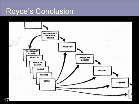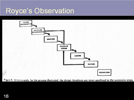 And Robert Martin offered a complete tour of TDD with a little tour-de-force of how the rigid Waterfall Development Cycle may have been intended to be more interactive: slides of Winton Royce's original notes for Waterfall Development in 1970 show feedback arrows throughout the development process a la Agile. [It was DOD's rigid version in spec 2167 and 2167A that gave us the linear model, according to Martin, but then they had all the SW $s in the '70s.]