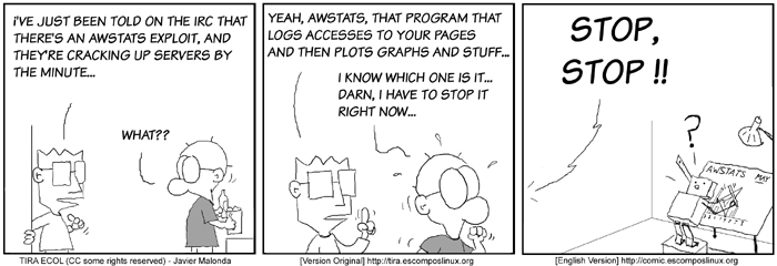 The Ecol comic strip is written for escomposlinux.org (ECOL), the web site that supports es.comp.os.linux, the Spanish USENET newsgroup for Linux. The strips are drawn in Spanish and then translated to English by the author.