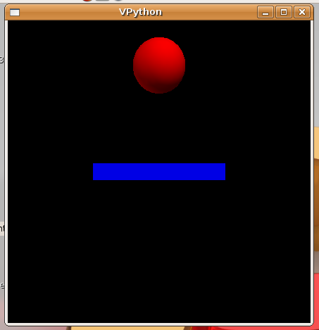 from visual import * #A floor is an instance of box object with attributes like length, height, width etc. floor = box(length=4, height=0.5, width=4, color=color.blue) # A ball is a spherical object with attributes like position,radius, color etc.. ball = sphere(pos=(0,4,0),radius=1, color=color.red) #Ball moves in the y axis ball.velocity = vector(0,-1,0) # small change in time dt = 0.01 while 1: #setting the rate of animation speed rate(100) # Change the position of ball based on the velocity on the y axis ball.pos = ball.pos + ball.velocity*dt if ball.y < 1: ball.velocity.y = -ball.velocity.y else: ball.velocity.y = ball.velocity.y - 9.8*dt
