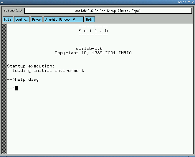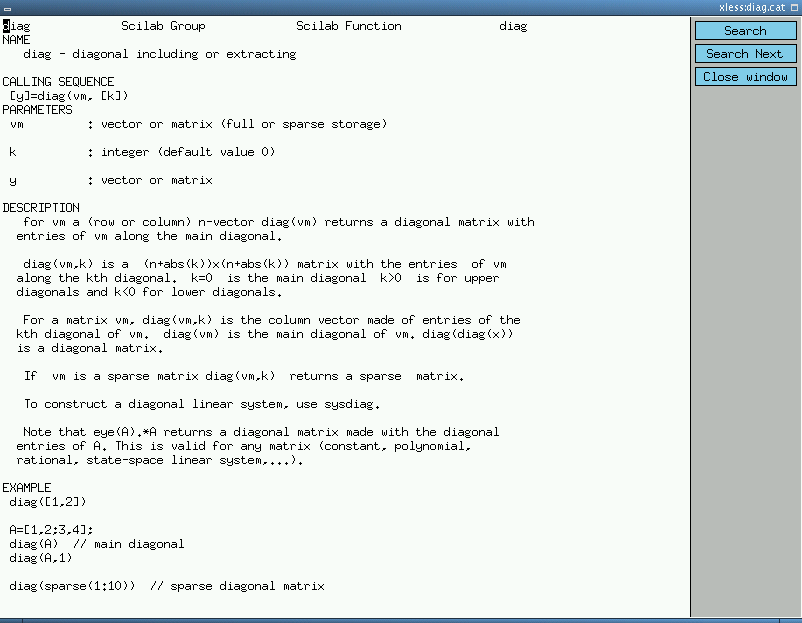we get a new X-window in which the Scilab interpreter runs. Asking for help opens an xless(1x) window. (Both these links are screenshots, so click on them.)