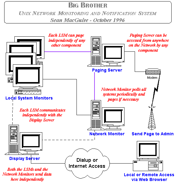 Big Brother was created by Sean MacGuire, while a consultant with the Tactik Infrastructure Group of Bell Sygma in Montreal. After fifteen years of Unix Systems Administration, Systems Design, and User Interface Design, this system was created to make his life easier.