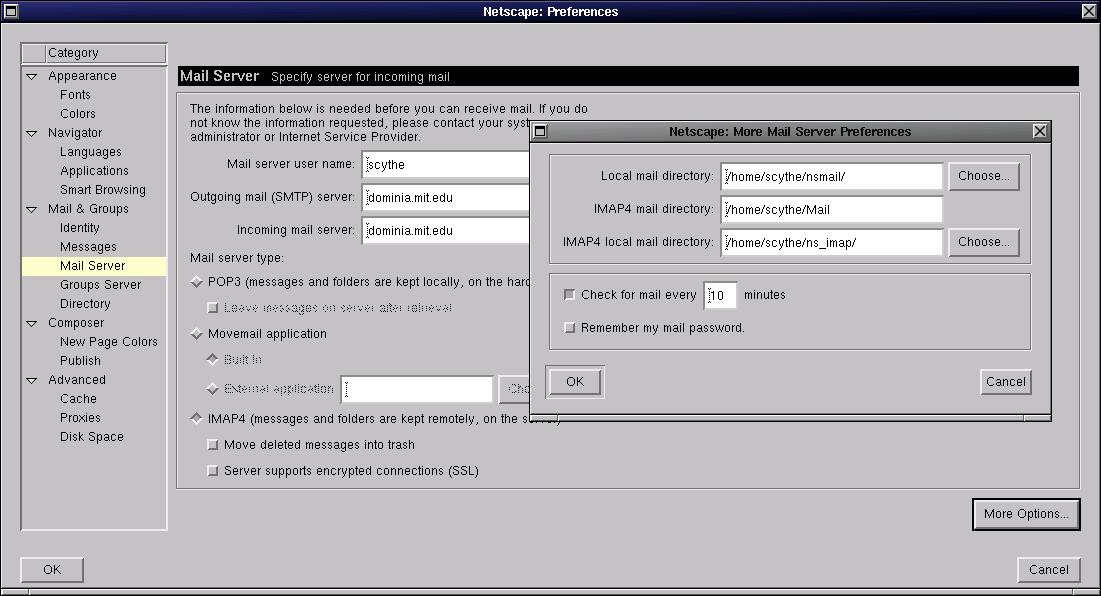 To set Netscape up for IMAP, select Preferences under the "Edit" menu, expand the "Mail & News" tab, click on the "Mail Server" entry, and enter in your username and your IMAP server. Obviously, make sure the server type "IMAP4" is selected. Click on the "More Options" box and enter in the mail folder directory you selected above. Finally, make sure the "Move Deleted Messages to Trash" box is not checked; this feature is rather broken and IMAP already provides flags to deal with deleted messages.