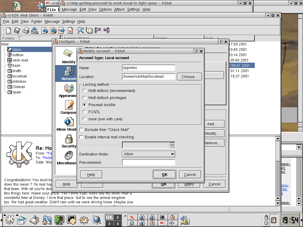 and I tried implementing some of his suggestions. My problem seems to be this: While fetchmail will get my e-mail, and pass it off to procmail, which delivers it to a designated file, I can't seem to read the e-mail with kmail. I've set my designated file as a local mailbox for kmail to read, but when I try to read it using kmail I get 1 of 2 behaviors: