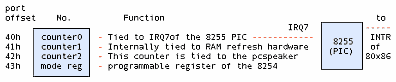 Effectively this means that the value of counter0 will determine the frequency of the timer ISR (Vector 8 in DOS) is called. Changing counter 0 changes the rate at which the timer ISR is called. Therefore if the same person wrote both the code for the ISR, and that for programming counter 0 of the 8254 timer chip, then he could get his ISR called at a predetermined rate as required.