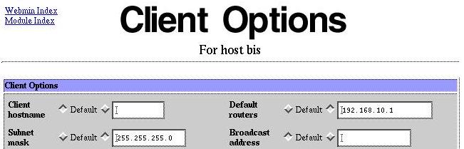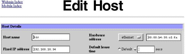 I then set up each specific host, specifying it's name, hardware MAC address and the IP address I want to serve to it. Note the IP address, now on subnet 192.168.10.0 .