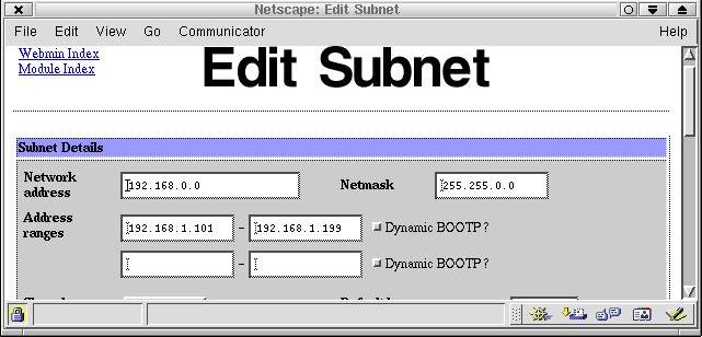 To begin, I used the webmin utility to set up a basic subnet DHCP service. Notice that this service has to be on network 192.168.0.0 with netmask 255.255.0.0 . This is because it must be accessible from al subnets.