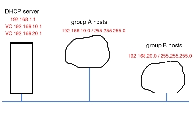 Using this, we can make a list of the MAC addresses of the hosts in our group A, and make DHCP serve them fixed IP addresses on the 192.168.10.0 subnet. The MAC addresses of hosts in group B are served addresses on the 192.168.20.0 subnet, and hosts that are not on either list (visitors' laptops, for example) get an address on subnet 192.168.1.0 .