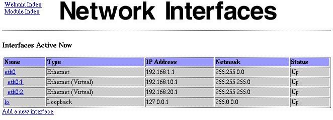 This is why our server must have an extra IP address for each subnet: 192.168.10.1, 192.168.20.1, etc. This can easily be set up by creating virtual network cards eth0:1, eth0:2, etc. with webmin: