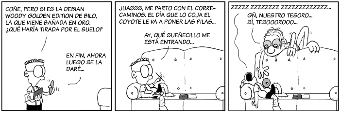 These cartoons were made for es.comp.os.linux (ECOL), the Spanish USENET newsgroup for Linux. The strips are drawn in Spanish and then translated to English by the author. Text commentary on this page is by LG Editor Iron. Your browser has shrunk the images to conform to the horizontal size limit for LG articles. For better picture quality, click on each cartoon to see it full size.