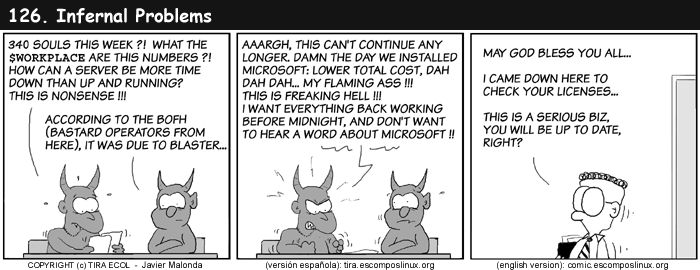 All Ecol cartoons are at tira.escomposlinux.org (Spanish), comic.escomposlinux.org (English) and http://tira.puntbarra.com/ (Catalan). The Catalan version is translated by the people who run the site; only a few episodes are currently available.