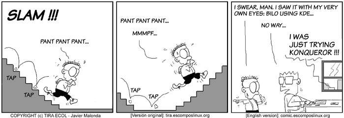 The Ecol comic strip is written for escomposlinux.org (ECOL), the web site tha t supports, es.comp.os.linux, the Spanish USENET newsgroup for Linux. The strips are drawn in Spanish and then translated to English by the author.
