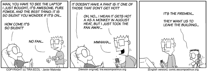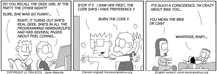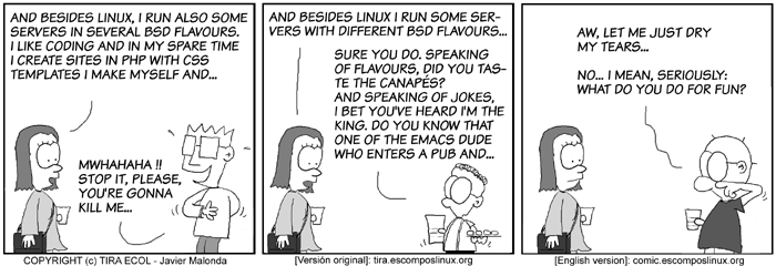 The Ecol comic strip is written for escomposlinux.org (ECOL), the web site that supports es.comp.os.linux, the Spanish USENET newsgroup for Linux. The strips are drawn in Spanish and then translated to English by the author.